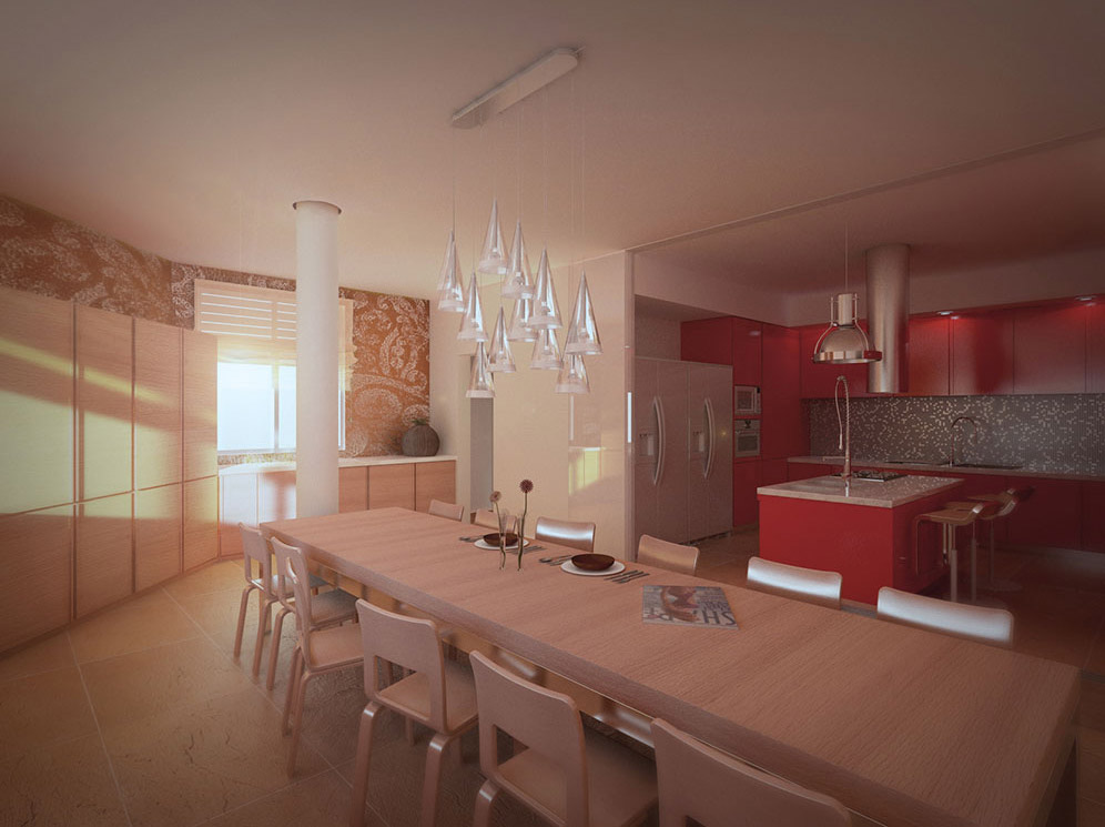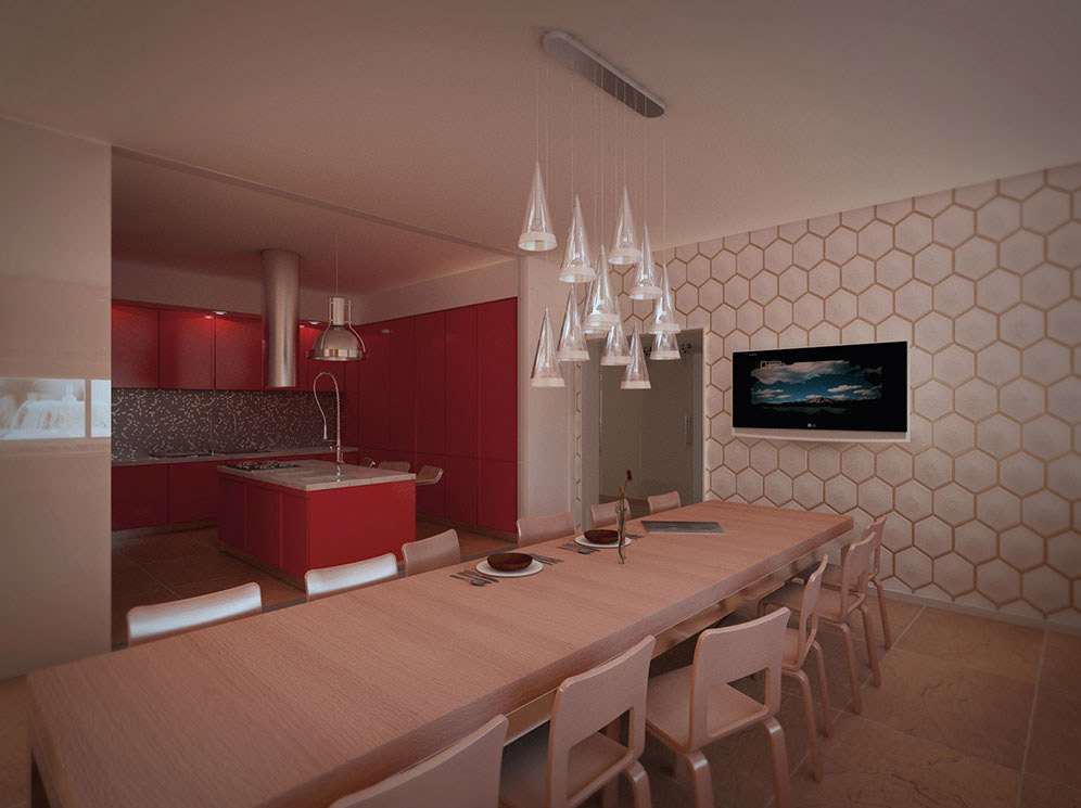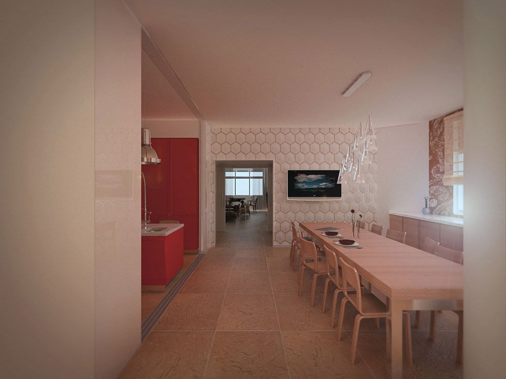 Em conformidade com a construção em curso, a orientação da mesa na sala de jantar enquadra-se entre uma coluna estrutural existente e uma parede com acabamento de mosaicos em formato hexagonal que irá conter a televisão, elemento fundamental que o cliente demonstrou dar enfase.