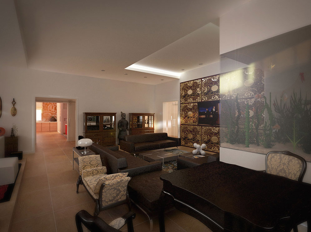 Na sala de estar optou-se por propor ao cliente, dois espaços distintos, um mais intimista e de conversação junto à janela e com um pé direito mais baixo, e um segundo espaço mais amplo com sofás voltados para uma parede forrada a painéis de madeira com motivos dourados e a televisão ao centro.